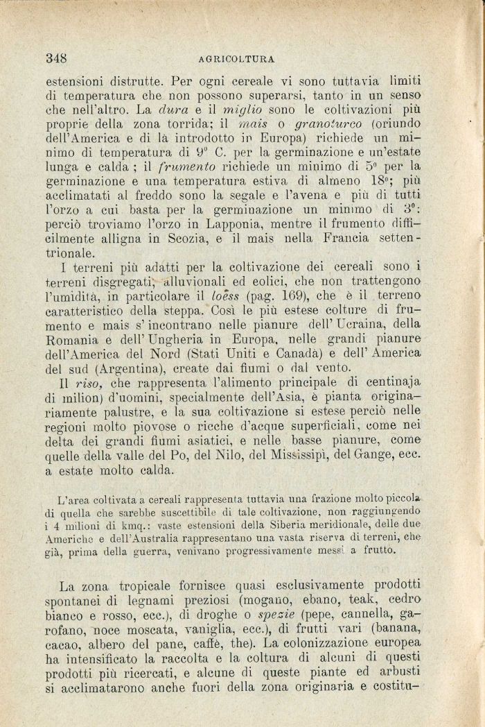 estensioni distrutte. Per ogni cereale vi sono tuttavia limiti di temperatura che non possono superarsi, tanto in un senso che nell'altro. La dura e il miglio sono le coltivazioni più proprie della zona torrida; il mais o granoturco (oriundo dell'America e di là introdotto in Europa) richiede un minimo di temperatura di 9' C. per la germinazione e un'estate lunga e calda ; il frumento richiede un minimo di 5° per la germinazione e una temperatura estiva di almeno 18'; più acclimatati al freddo sono la segale e l'avena e più di tutti l'orzo a cui basta per la germinazione un minimo di 3°: perciò troviamo l'orzo in Lappouia, mentre il frumento difficilmente alligna in Scozia, e il mais nella Francia settentrionale.