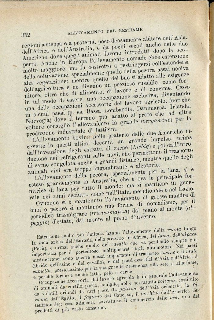 regioni a steppa e a prateria, poco densamente abitate dell'Asia, dell'Africa e dell'Australia, e da pochi secoli anche delle due Americhe dove quegli animali furono introdotti dopo la scoperta. Anche in Europa l'allevamento nomade ebbe estensione molto maggiore, ma fu costretto a restringersi coll'estendersi della coltivazione, specialmente quello della pecora assai nociva alla vegetazione; mentre quello del bue si adattò alle esigenze dell'agricoltura e ne divenne un prezioso sussidio, come fornitore, oltre che di alimento, di lavoro e di concime. Cessò in tal modo di essere una occupazione esclusiva, diventando una delle occupazioni accessorie del lavoro agricolo, fuor che in alcuni paesi (p. es. Bassa Lombardia, Danimarca, Irlanda, Norvegia) dove il terreno più adatto al prato che ad altre colture consigliò 1' allevamento in grande (bergamine) per la produzione industriale di latticini.