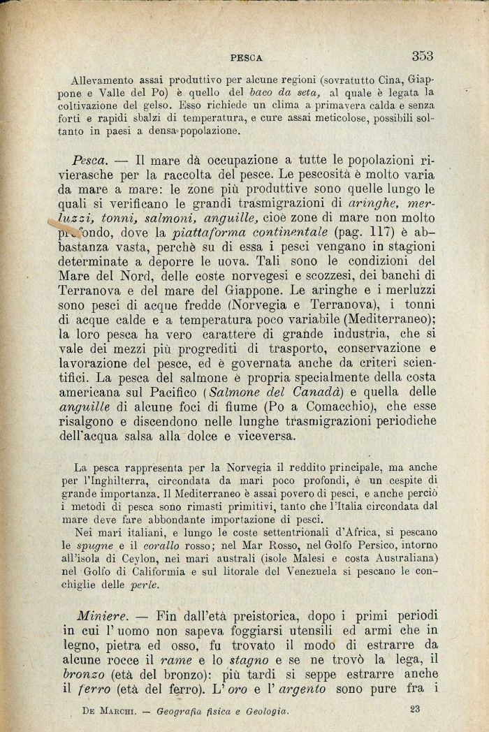 Pesca. — Il mare dà occupazione a tutte le popolazioni rivierasche per la raccolta del pesce. Le pescosità è molto varia da mare a mare: le zone più produttive sono quelle lungo le quali si verificano le grandi trasmigrazioni di aringhe, merluzzi, tonni, salmoni, anguille, cioè zone di mare non molto pi ^ 'ondo, dove la piattaforma continentale (pag. 117) è abbastanza vasta, perchè su di essa i pesci vengano in stagioni determinate a deporre le uova. Tali sono le condizioni del Mare del Nord, delle coste norvegesi e scozzesi, dei banchi di Terranova e del mare del Giappone. Le aringhe e i merluzzi sono pesci di acque fredde (Norvegia e Terranova), i tonni di acque calde e a temperatura poco variabile (Mediterraneo); la loro pesca ha vero carattere di grande industria, che si vale dei mezzi più progrediti di trasporto, conservazione e lavorazione del pesce, ed è governata anche da criteri scientifici. La pesca del salmone è propria specialmente della costa americana sul Pacifico (Salmone del Canadà) e quella delle anguille di alcune foci di fiume (Po a Comacchio), che esse risalgono e discendono nelle lunghe trasmigrazioni periodiche dell'acqua salsa alla dolce e viceversa.