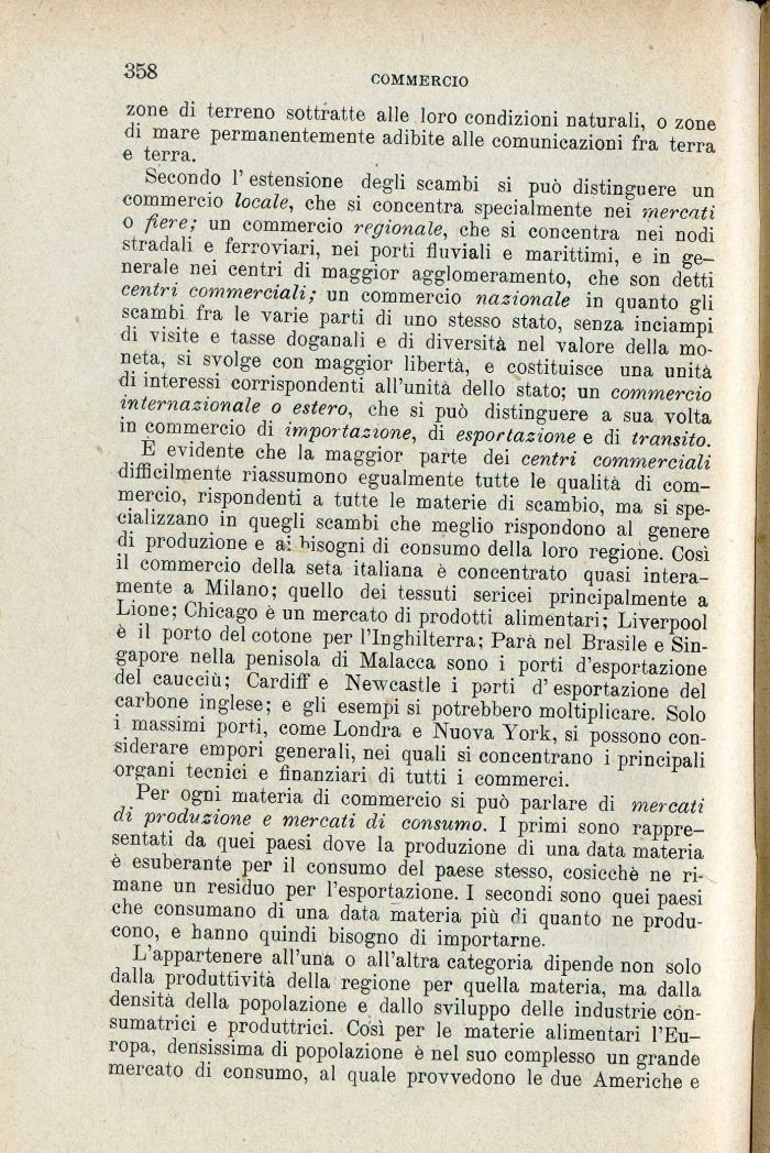 0 fiere; un commercio regionale, che si concentra nei nodi stradali e ferroviari, nei porti fluviali e marittimi, e in generale nei centri di maggior agglomeramento, che son detti centri commerciali ; un commercio nazionale in quanto gli scambi fra le varie parti di uno stesso stato, senza inciampi di visite e tasse doganali e di diversità nel valore della moneta, si svolge con maggior libertà, e costituisce una nnità di interessi corrispondenti all'unità dello stato; un commercio internazionale o estero, che si può distinguere a sua volta in commercio di importazione, di esportazione e di transito.