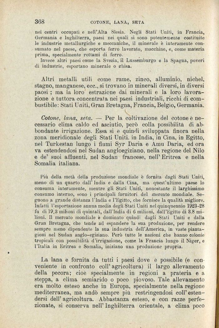 Cotone, lana,. seta. — Per la coltivazione del cotone è necessario clima caldo ed asciutio, però colla possibilità di abbondante irrigazione. Essa si è quindi sviluppata finora nella zona meridionale degli Stati Uniti, in India, in Cina, in Egitto, nel Turkestan lungo i fiumi Syr Daria e Amu Daria, ed ora va estendendosi nel Sudan angloegiziano, nella regione del Nilo e de' suoi affluenti, nel Sudan francese, nell' Eritrea e nella Somalia italiana.