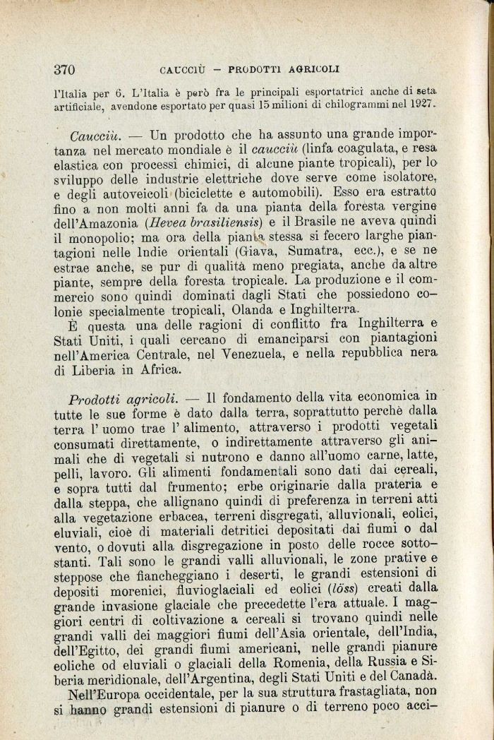 Caucciù. — Un prodotto che ha assunto una grande importanza nel mercato mondiale è il caucciù (linfa coagulata, e resa elastica con processi chimici, di alcune piante tropicali), per lo sviluppo delle industrie elettriche dove serve come isolatore, e degli autoveicoli (biciclette e automobili). Esso era estratto fino a non molti anni fa da una pianta della foresta vergine dell'Amazonia (Hevea brasiliensis) e il Brasile ne aveva quindi il monopolio; ma ora della pianta stessa si fecero larghe piantagioni nelle Indie orientali (G-iava, Sumatra, ecc.), e se ne estrae anche, se pur di qualità meno pregiata, anche da altre piante, sempre della foresta tropicale. La produzione e il commercio sono quindi dominati dagli Stati che possiedono colonie specialmente tropicali, Olanda e Inghilterra.