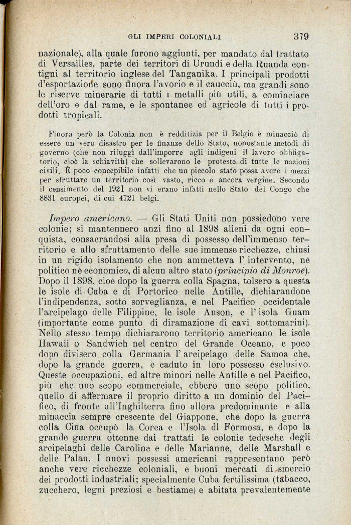 Impero americano. — Gli Stati Uniti non possiedono vere colonie; si mantennero anzi fino al 1898 alieni da ogni conquista, consacrandosi alla presa di possesso dell'immenso territorio e allo sfruttamento delle sue immense ricchezze, chiusi in un rigido isolamento che non ammetteva 1' intervento, nè politico nè economico, di alcun altro stato (principio di Monroe). Dopo il 1898, cioè dopo la guerra colla Spagna, tolsero a questa le isole di Cuba e di Portorico nelle Antille, dichiarandone l'indipendenza, sotto sorveglianza, e nel Pacifico occidentale l'arcipelago delle Filippine, le isole Anson, e l'isola Guam (importante come punto di diramazione di cavi sottomarini). Nello stesso tempo dichiararono territorio americano le isole Hawaii o Sandwich nel centro del Grande Oceano, e poco dopo divisero colla Germania 1' arcipelago delle Samoa che, dopo la grande guerra, è caduto in loro possesso esclusivo. Queste occupazioni, ed altre minori nelle Antille e nel Pacifico, più che uno scopo commerciale, ebbero uno scopo politico, quello di affermare il proprio diritto a un dominio del Pacifico, di fronte all'Inghilterra fino allora predominante e alla minaccia sempre crescente del Giappone, che dopo la guerra colla Cina occupò la Corea e l'Isola di Formosa, e dopo la grande guerra ottenne dai trattati le colonie tedesche degli arcipelaghi delle Caroline e delle Marianne, delle Marshall e delle Palati. I nuovi possessi americani rappresentano però anche vere ricchezze coloniali, e buoni mercati di smercio dei prodotti industriali; specialmente Cuba fertilissima (tabacco, zucchero, legni preziosi e bestiame) e abitata prevalentemente