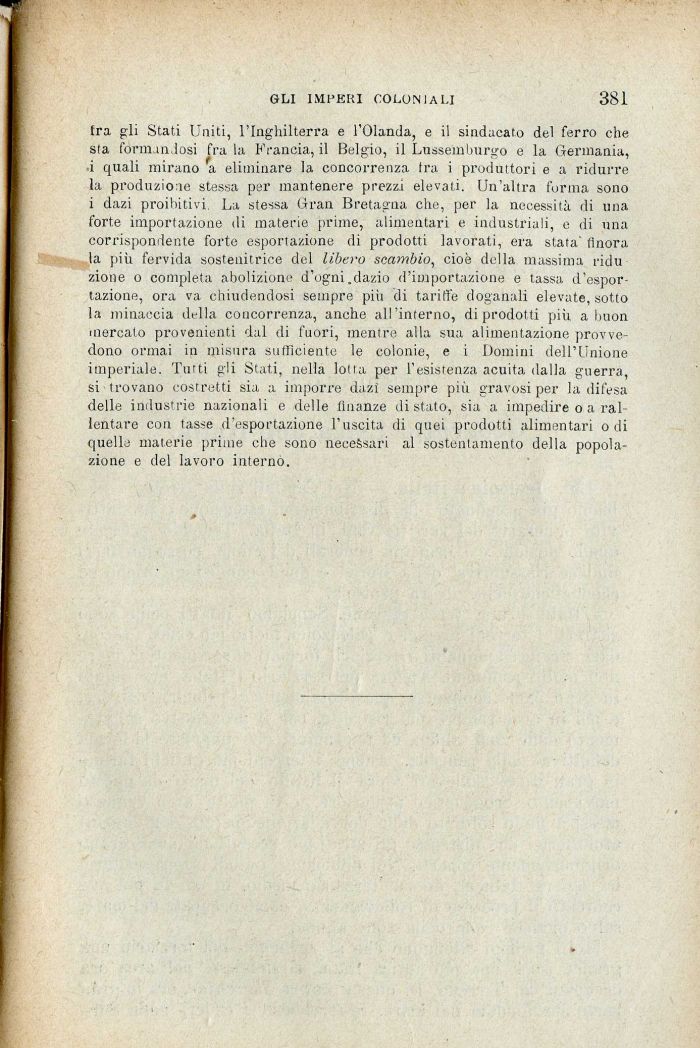 tra gli Stati Uniti, l'Inghilterra e l'Olanda, e il sindacato del ferro che sta formandosi fra la Francia, il Belgio, il Lussemburgo e la Germania, i quali mirano a eliminare la concorrenza tra i produttori e a ridurre la produzione stessa per mantenere prezzi elevati. Un'altra forma sono i dazi proibitivi. La stessa Gran Bretagna che, per la necessità di una forte importazione di materie prime, alimentari e industriali, e di una corrispondente forte esportazione di prodotti lavorati, era stata' finora la più fervida sostenitrice del libero scambio, cioè della massima ridu zione o completa abolizione d'ogni.dazio d'importazione e tassa d'esportazione, ora va chiudendosi sempre più di tariffe doganali elevate, sotto la minaccia della concorrenza, anche all'interno, di prodotti più a buon mercato provenienti dal di fuori, mentre alla sua alimentazione provvedono ormai in misura sufficiente le colonie, e i Domini dell'Unione imperiale. Tutti gli Stati, nella lolta per l'esistenza acuita dalla guerra, si trovano costretti sia a imporre dazi sempre più gravosi per la difesa delle industrie nazionali e delle finanze di stato, sia a impedire o a rallentare con tasse d'esportazione l'uscita di quei prodotti alimentari odi quella materie prime che sono necessari al sostentamento della popolazione e del lavoro internò.