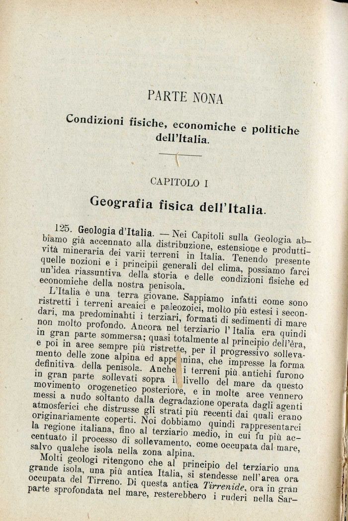 L'Italia è una terra giovane. Sappiamo infatti come sono ristretti i terreni arcaici e paleozoici, molto più estesi i secondari, ma predominahti i terziari, formati di sedimenti di mare non molto profondo. Ancora nel terziario l'Italia era quindi in gran parte sommersa; quasi totalmente al principio dell'èra, e poi in aree sempre più ristrette, per il progressivo sollevamento delle zone alpina ed a,pp? mina, che impresse la forma definitiva della penisola. Anche i terreni più antichi furono in gran parte sollevati sopra i livello del mare da questo movimento orogenetico posteriore, e in molte aree vennero messi a nudo soltanto dalla degradazione operata dagli agenti atmosferici che distrusse gli strati più recenti dai quali erano originariamente coperti. Noi dobbiamo quindi rappresentarci la regione italiana, fino al terziario medio, in cui fu più accentuato il processo di sollevamento, come occupata dal mare, salvo qualche isola nella zona alpina.