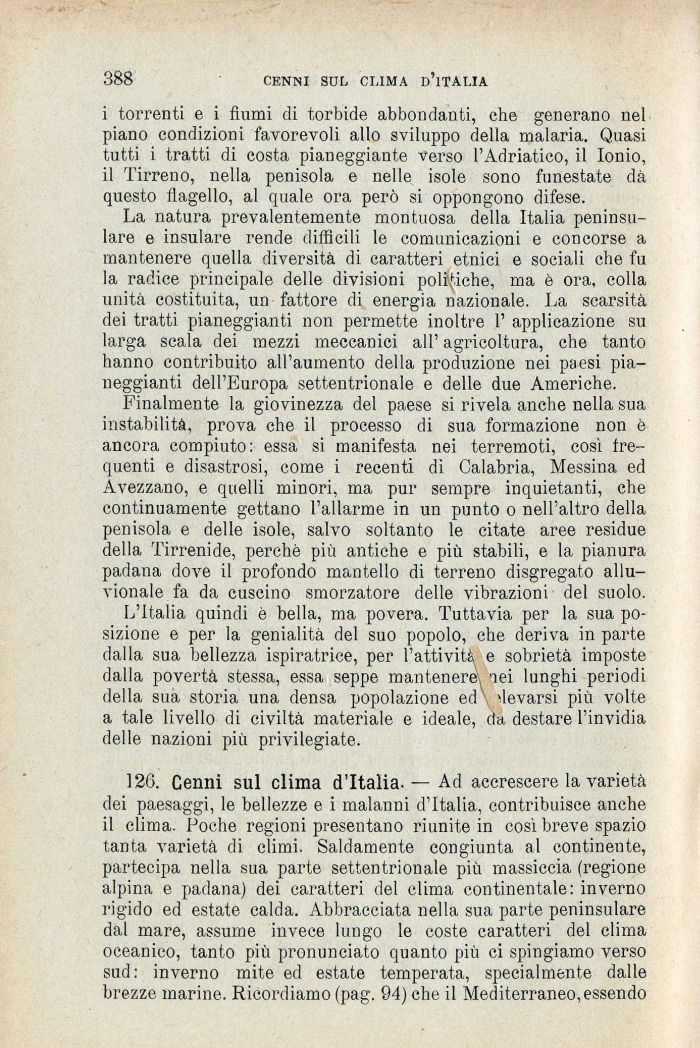 L'Italia quindi è bella, ma povera. Tuttavia per la sua posizione e per la genialità del suo popolo, che deriva in parte dalla sua bellezza ispiratrice, per l'attività e sobrietà imposte dalla povertà stessa, essa seppe mantenere, 'lei lunghi periodi della sua storia una densa popolazione ed levarsi più volte a tale livello di civiltà materiale e ideale, da destare l'invidia delle nazioni più privilegiate.