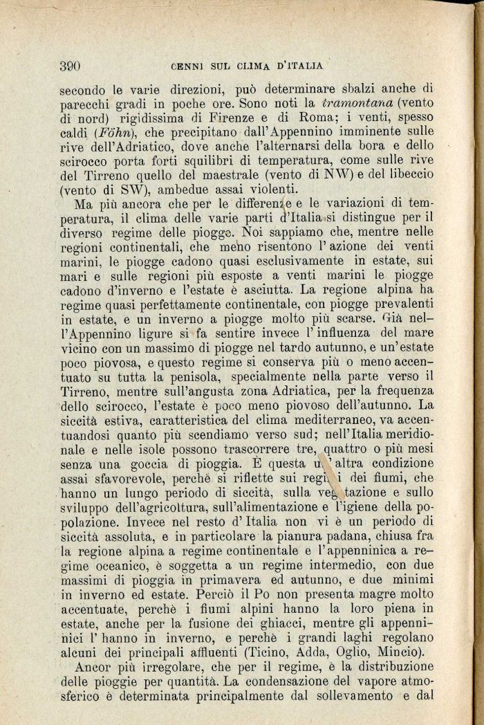 secondo le varie direzioni, può determinare sbalzi anche di parecchi gradi in poche ore. Sono noti la tramontana (vento di nord) rigidissima di Firenze e di Roma; i venti, spesso caldi (Fóhn), che precipitano dall'Appennino imminente sulle rive dell'Adriatico, dove anche l'alternarsi della bora e dello scirocco porta forti squilibri di temperatura, come sulle rive del Tirreno quello del maestrale (vento di NW) e del libeccio (vento di SW), ambedue assai violenti.