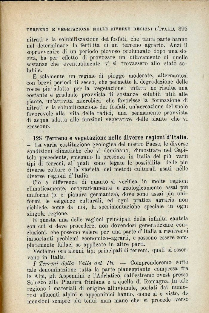 — La varia costituzione geologica del nostro Paese, le diverse condizioni climatiche che vi dominano, dimostrate nel Capitolo precedente, spiegano la presenza in Italia dei più varii tipi di terreni, ai quali sono legate le possibilità delle più diverse colture e la varietà dei metodi culturali usati nelle diverse regioni d'Italia.