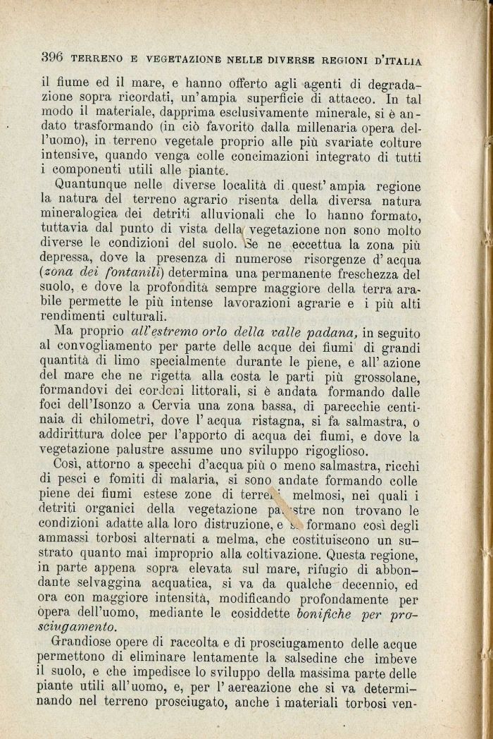 Così, attorno a specchi d'acqua più o meno salmastra, ricchi di pesci e fomiti di malaria, si sono andate formando colle piene dei fiumi estese zone di terrei: melmosi, nei quali i detriti organici della vegetazione pa. stre non trovano le condizioni adatte alla loro distruzione, e b. formano così degli ammassi torbosi alternati a melma, che costituiscono un su-strato quanto mai improprio alla coltivazione. Questa regione, in parte appena sopra elevata sul mare, rifugio di abbondante selvaggina acquatica, si va da qualche decennio, ed ora con maggiore intensità, modificando profondamente per opera dell'uomo, mediante le cosiddette bonifiche per prosciugamento.