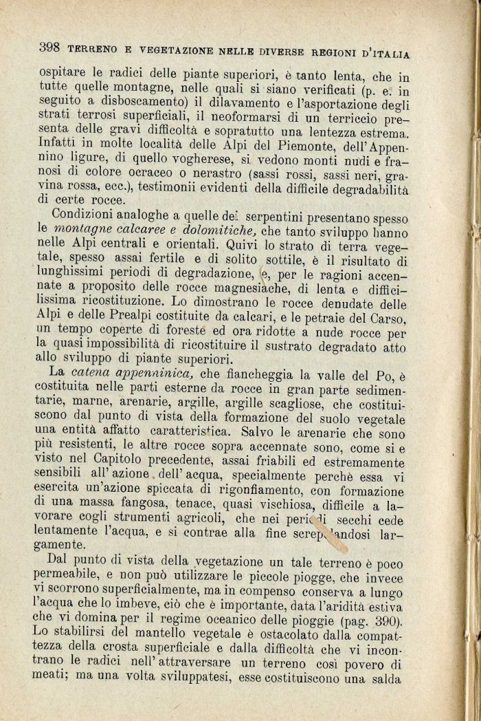 ospitare le radici delle piante superiori, è tanto lenta, che in tutte quelle montagne, nelle quali si siano verificati (p. e. in seguito a disboscamento) il dilavamento e l'asportazione degli strati terrosi superficiali, il neoformarsi di un terriccio presenta delle gravi difficoltà e sopratutto una lentezza estrema. Infatti in molte località delle Alpi del Piemonte, dell'Appennino ligure, di quello vogherese, si vedono monti nudi e franosi di colore ocraceo o nerastro (sassi rossi, sassi neri, gravina rossa, ecc.), testimonii evidenti della difficile degradabilità di certe rocce.
