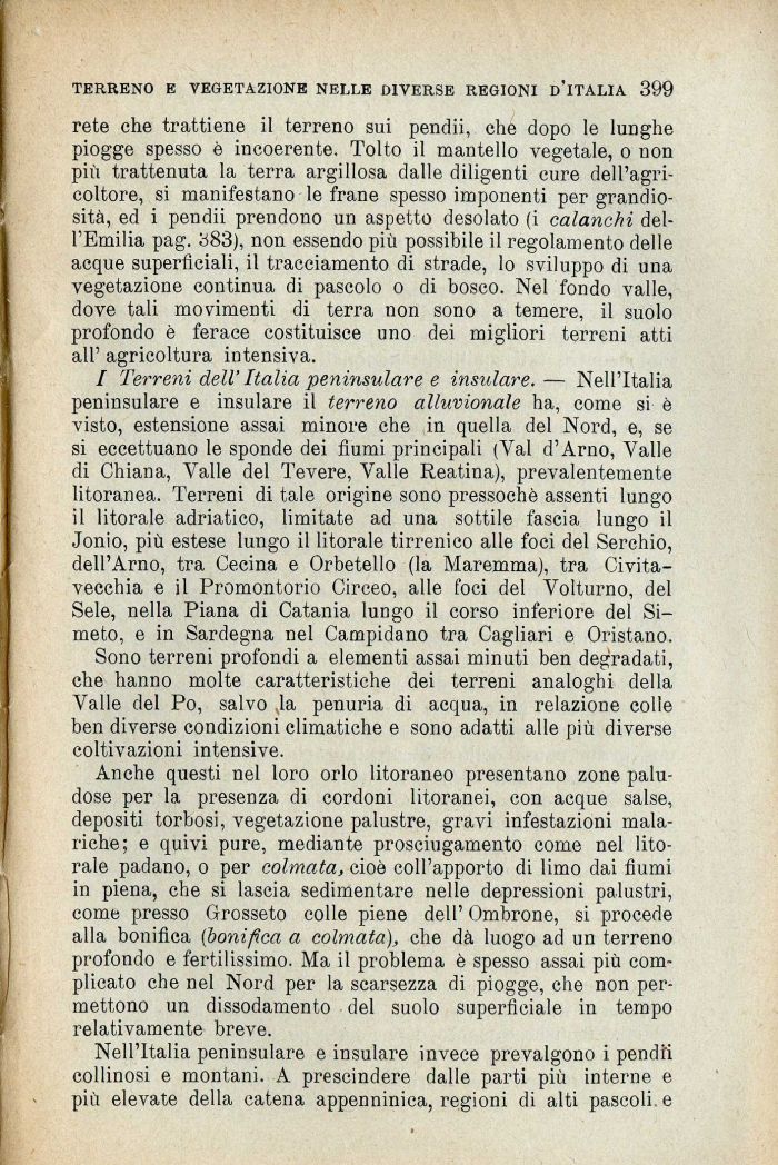 rete che trattiene il terreno sui pendii, che dopo le lunghe piogge spesso è incoerente. Tolto il mantello vegetale, o non più trattenuta la terra argillosa dalle diligenti cure dell'agricoltore, si manifestano le frane spesso imponenti per grandiosità, ed i pendii prendono un aspetto desolato (i calanchi dell'Emilia pag. 383), non essendo più possibile il regolamento delle acque superficiali, il tracciamento di strade, lo sviluppo di una vegetazione continua di pascolo o di bosco. Nel fondo valle, dove tali movimenti di terra non sono a temere, il suolo profondo è ferace costituisce uno dei migliori terreni atti all' agricoltura intensiva.
