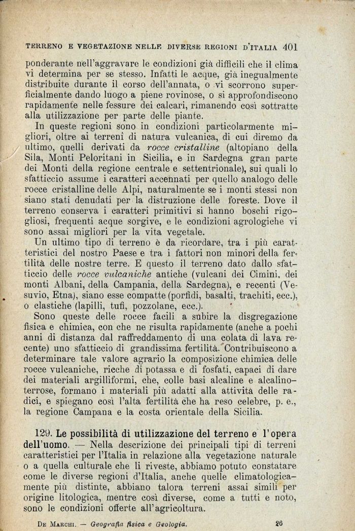 Un ultimo tipo di terreno è da ricordare, tra i più caratteristici del nostro Paese e tra i fattori non minori della fertilità delle nostre terre. E questo il terreno dato dallo sfatticcio delle rocce vulcaniche antiche (vulcani dei Gimini, dei monti Albani, della Campania, della Sardegna), e recenti (Vesuvio, Etna), siano esse compatte (porfidi, basalti, trachiti, ecc.), o clastiche (lapilli, tufi, pozzolane, ecc.).