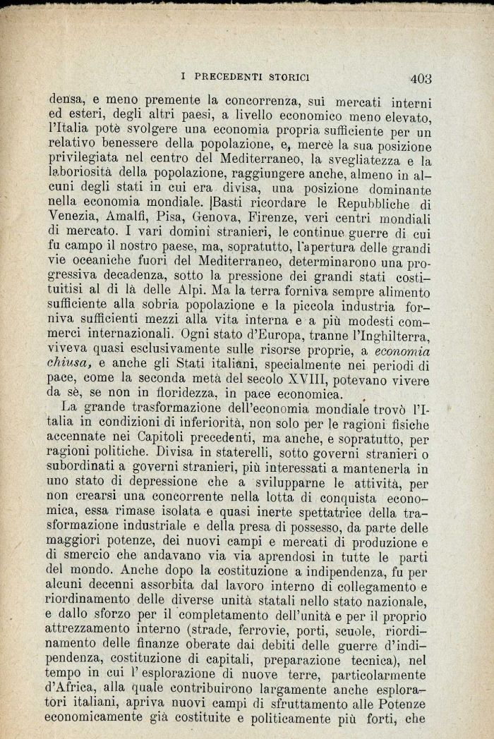 densa, e meno premente la concorrenza, sui mercati interni ed esteri, degli altri paesi, a livello economico meno elevato, l'Italia potč svolgere una economia propria sufficiente per un relativo benessere della popolazione, e, mercč la sua posizione privilegiata nel centro del Mediterraneo, la svegliatezza e la laboriositą della popolazione, raggiungere anche, almeno in alcuni degli stati in cui era divisa, una posizione dominante nella economia mondiale. ,Basti ricordare le Repubbliche di Venezia, Amalfi, Pisa, Genova, Firenze, veri centri mondiali di mercato. I vari domini stranieri, le continue, guerre di cui fu campo il nostro paese, ma, sopratutto, l'apertura delle grandi vie oceaniche fuori del Mediterraneo, determinarono una progressiva decadenza, sotto la pressione dei grandi stati costituitisi al di lą delle Alpi. Ma la terra forniva sempre alimento sufficiente alla sobria popolazione e la piccola industria forniva sufficienti mezzi alla vita interna e a pił modesti commerci internazionali. Ogni stato d'Europa, tranne l'Inghilterra, viveva quasi esclusivamente sulle risorse proprie, a economia chiusa, e anche gli Stati italiani, specialmente nei periodi di pace, come la seconda metą del secolo XVIII, potevano vivere da sč, se non in floridezza, in pace economica.