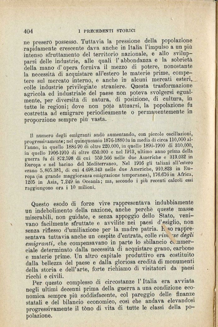 Per questo complesso di circostanze l'Italia era avviata negli ultimi decenni prima della guerra a una condizione economica sempre più soddisfacente, col pareggio delle finanze statali e del bilancio economico, cosi che andava elevandosi progressivamente il tòno di vita di tutte le classi della popolazione.