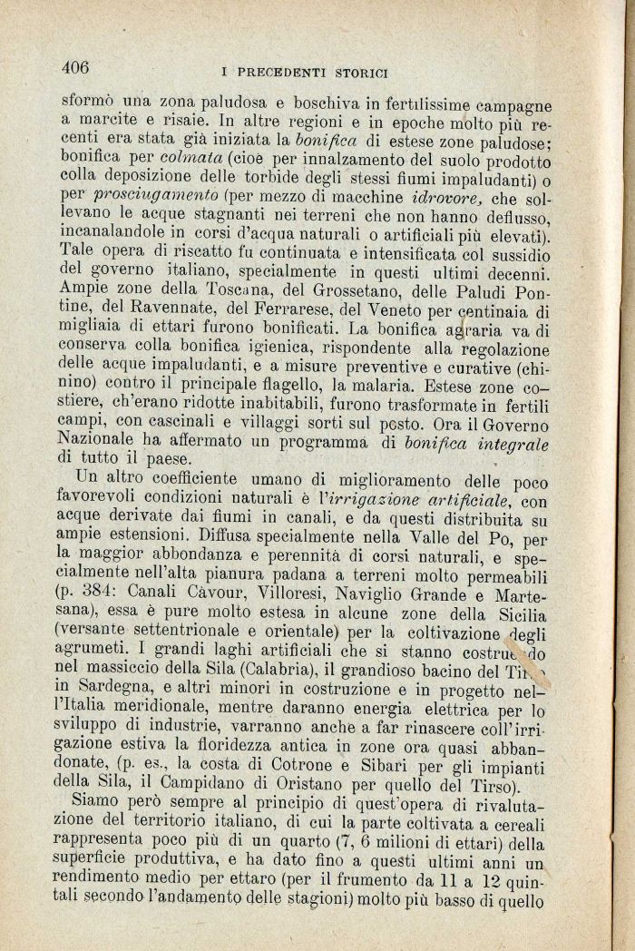 sformò una zona paludosa e boschiva in fertilissime campagne a marcite e risaie. In altre regioni e in epoche molto più recenti era stata già iniziata la bonifica di estese zone paludose; bonifica per colmala (cioè per innalzamento del suolo prodotto colla deposizione delle torbide degli stessi fiumi impaludanti) o per prosciugamento (per mezzo di macchine idrovore, che sollevano le acque stagnanti nei terreni che non hanno deflusso, incanalandole in corsi d'acqua naturali o artificiali più elevati). Tale opera di riscatto fu continuata e intensificata col sussidio del governo italiano, specialmente in questi ultimi decenni. Ampie zone della Toscana, del Grossetano, delle Paludi Pontine, del Ravennate, del Ferrarese, del Veneto per centinaia di migliaia di ettari furono bonificati. La bonifica agraria va di conserva colla bonifica igienica, rispondente alla regolazione delle acque impaludanti, e a misure preventive e curative (chinino) contro il principale flagello, la malaria. Estese zone costiere, ch'erano ridotte inabitabili, furono trasformate in fertili campi, con cascinali e villaggi sorti sul pesto. Ora il Governo Nazionale ha affermato un programma di bonifica integrale di tutto il paese.