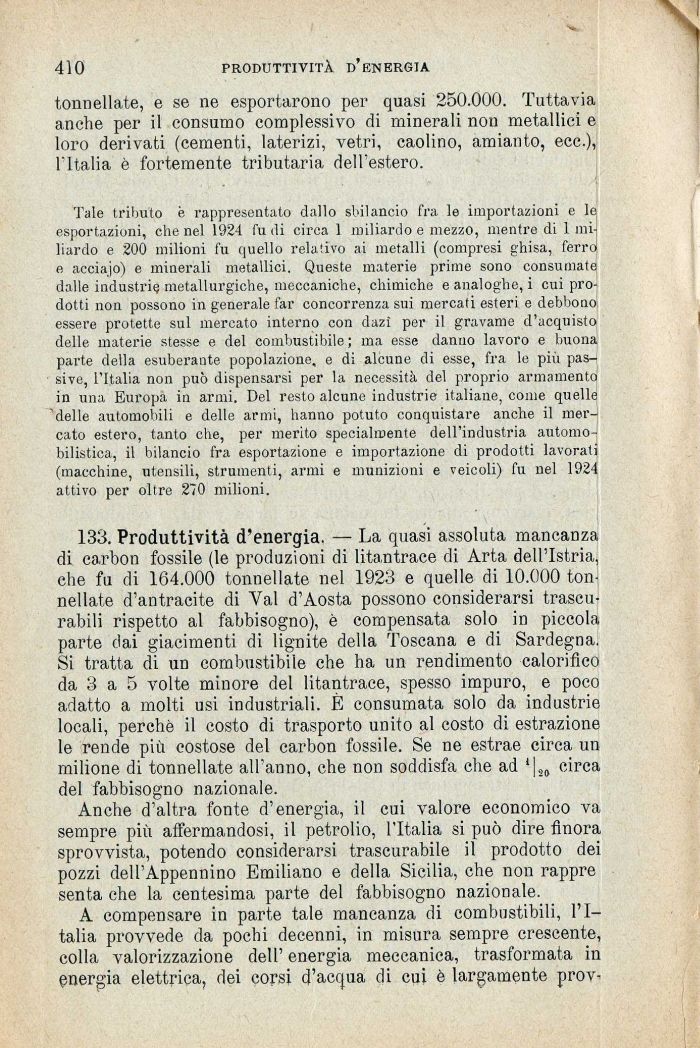 Anche d'altra fonte d'energia, il cui valore economico va sempre più affermandosi, il petrolio, l'Italia si può dire finora sprovvista, potendo considerarsi trascurabile il prodotto dei pozzi dell'Appennino Emiliano e della Sicilia, che non rappre senta che la centesima parte del fabbisogno nazionale.
