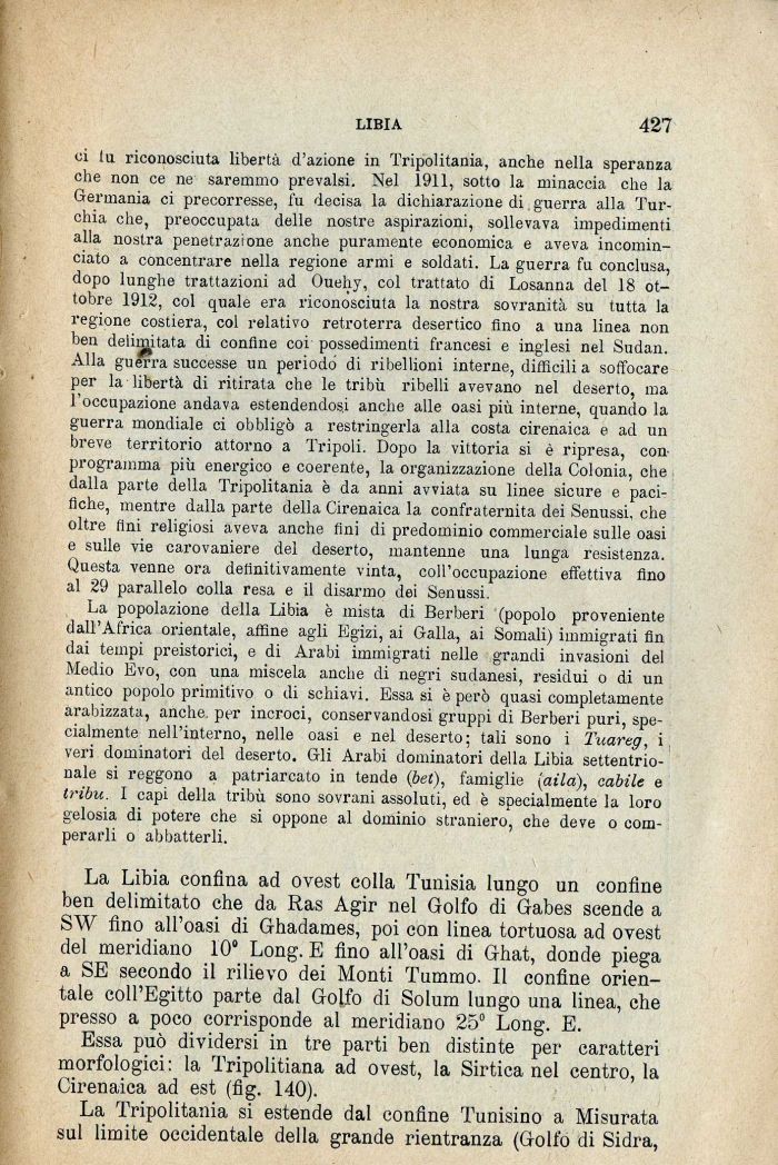 ci lii riconosciuta libertà d'azione in Tripolitania, anche nella speranza che non ce ne saremmo prevalsi. Nel 1911, sotto la minaccia che la Germania ci precorresse, fu decisa la dichiarazione di. guerra alla Turchia che, preoccupata delle nostre aspirazioni, sollevava impedimenti alla nostra penetrazione anche puramente economica e aveva incominciato a concentrare nella regione armi e soldati. La guerra fu conclusa, dopo lunghe trattazioni ad Ouehy, col trattato di Losanna del 18 ottobre 1912, col quale era riconosciuta la nostra sovranità su tutta la regione costiera, col relativo retroterra desertico fino a una linea non ben delimitata di confine coi possedimenti francesi e inglesi nel Sudan. Alla guerra successe un periodò di ribellioni interne, difficili a soffocare per la libertà di ritirata che le tribù ribelli avevano nel deserto, ma l'occupazione andava estendendosi anche alle oasi più interne, quando la guerra mondiale ci obbligò a restringerla alla costa cirenaica e ad un breve territorio attorno a Tripoli. Dopo la vittoria si è ripresa, con-programma più energico e coerente, la organizzazione della Colonia, che dalla parte della Tripolitania è da anni avviata su linee sicure e pacifiche, mentre dalla parte della Cirenaica la confraternita dei Senussi, che oltre fini religiosi aveva anche fini di predominio commerciale sulle oasi e sulle vie carovaniere del deserto, mantenne una lunga resistenza. Questa venne ora definitivamente vinta, coll'occupazione effettiva fino al 29 parallelo colla resa e il disarmo dei Senussi.