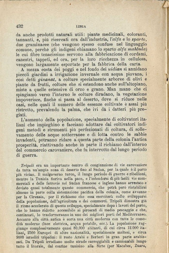 Tripoli era un importante centro di congiunzione di vie carovaniere da tutta un'ampia zona di deserto fino al Sudan, per la quale è il porto più vicino. Il malgoverno turco, il lungo periodo di guerre e ribellioni, mentre la Tnnisia fioriva nella pace, e l'estendersi di più facili vie commerciali e delle ferrovie nel Sudan francese e inglese hanno arrestato e deviato quasi totalmente questo commercio, che potrà però ristabilirsi almeno in parie colla sistemazione pacifica della colonia, come avvenne per la Cirenaia, per il richiamo che essa eserciterà collo svilupparsi della popolazione, dell'agricoltura e dei commerci. Tripoli dimostra già il ritmo accelerato di questo sviluppo, specialmente dopo i lavori del porto, che lo hanno ridotto accessibile ai piroscafi di medio pescaggio e che, continuati, lo trasformeranno in uno dei migliori porti del Mediterraneo. Accanto alla città antica è sorta una città moderna con tutte le comodità moderne (luce elettrica, acqua potabile, ecc.). La popolazione raggiunge complessivamente quasi 80.000 abitanti, di cui circa 12.000 italiani, 2500 Europei di altre nazionalità, specialmente maltesi, e circa 9000 israeliti tripolini: il resto Arabi e Berberi in gran parte arabiz-zati. Da Tripoli irradiano molte strade carreggiabili e camionabili lungo tutto il litorale, dal confine tunisino alla Sirte (per Macabez, Zuara,