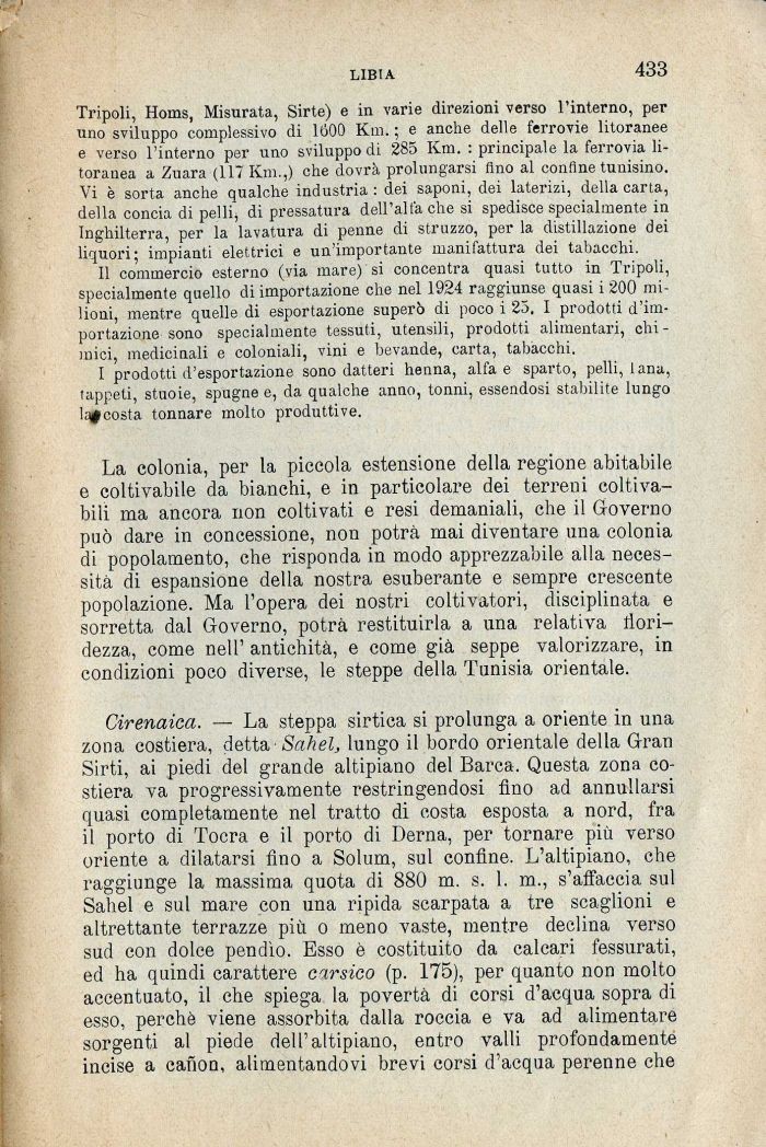 La colonia, per la piccola estensione della regione abitabile e coltivabile da bianchi, e in particolare dei terreni coltivabili ma ancora non coltivati e resi demaniali, che il Governo può dare in concessione, non potrà mai diventare una colonia di popolamento, che risponda in modo apprezzabile alla necessità di espansione della nostra esuberante e sempre crescente popolazione. Ma l'opera dei nostri coltivatori, disciplinata e sorretta dal Governo, potrà restituirla a una relativa floridezza, come nell' antichità, e come già seppe valorizzare, in condizioni poco diverse, le steppe della Tunisia orientale.