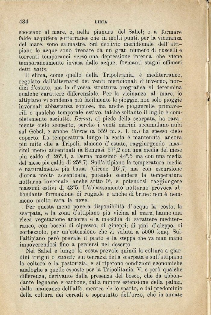 Il clima, come quello della Tripolitania, è mediterraneo, regolato dall'alternarsi dei venti meridionali d'inverno, nordici d'estate, ma la diversa struttura orografica vi determina qualche carattere differenziale. Per la vicinanza al mare, lo altipiano vi condensa più facilmente le pioggie, non solo pioggie invernali abbastanza copiose, ma anche pioggerelle primaverili e qualche temporale estivo, talché soltanto il luglio è completamente asciutto. Derna, al piede della scarpata, ha raramente cielo scoperto, perchè i venti marini accumulano nubi sul Gebel, e anche Cirene (a 559 m. s. 1. m.) ha spesso cielo coperto. La temperatura lungo la costa è mantenuta ancora più mite che a Tripoli, almeno d' estate, raggiurgendo massimi meno accentuati (a Bengasi 37°,2 con una media del mese più caldo di 26°,4, a Derna massimo 44°,5 ma con una media del mese più caldo di 25°,7). Sull'altipiano la temperatura media è naturalmente più bassa (Cirene 16°,7) ma con escursione diurna molto accentuata, potendo scendere la temperatura notturna invernale anche sotto 0°, e potendosi raggiungere massimi estivi di 43°5. L'abbassamento notturno provoca abbondante formazione di rugiade e anche di brine: non è nemmeno molto rara la neve.