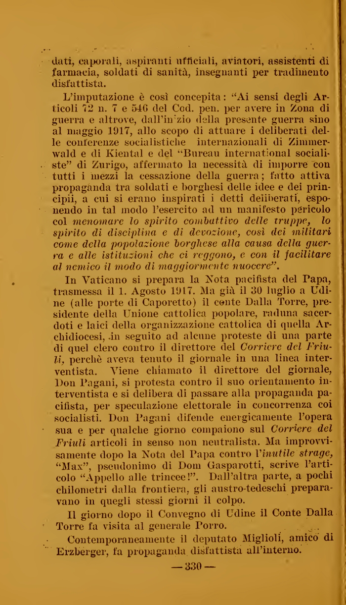 In Vaticano si prepara la Nota pacifista del Papa, trasmessa il 1. Agosto 1917. Ma già il 30 luglio a Udine (alle porte di Caporetto) il conte Dalla Torre, presidente della Unione cattolica popolare, raduna sacerdoti e laici della organizzazione cattolica di quella Ar-chidiocesi, .in seguito ad alcune proteste di una parte di quel clero contro il direttore del Corriere del Friuli, perchè aveva tenuto il giornale in una linea interventista. Viene chiamato il direttore del giornale, Don Pagani, si protesta contro il suo orientamento interventista e si delibera di passare alla propaganda pacifista, per speculazione elettorale in concorrenza coi socialisti. Don Pagani difende energicamente l'opera sua e per qualche giorno compaiono sul Corriere del Friuli articoli in senso non neutralista. Ma improvvisamente dopo la Nota del Papa contro Vinutile strage, "Max", pseudonimo di Doni Gasparotti, scrive l'articolo "Appello alle trincee!". Dall'altra parte, a pochi chilometri dalla frontiera, gli austro-tedeschi prepara-vauo iu quegli stessi giorni il colpo.