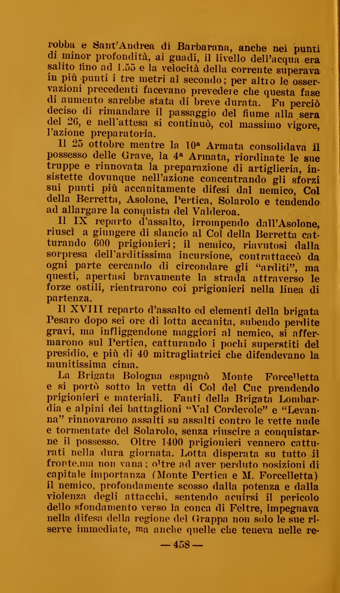 La Brigata Bologna espugnò Monte Po ree1 letta e si portò sotto la vetta di Col del Cuc prendendo prigionieri e materiali. Fanti della Brigata Lombardia e alpini dei battaglioni "Val Cordevole" e "Levan-na" rinnovarono assalti su assalti contro le vette nude e tormentate del Solarolo, senza riuscire a conquistarne il possesso. Oltre 1400 prigionieri vennero catturati nella dura giornata. Lotta disperata su tutto il fronte.ma non vana ; o'tre ad aver perduto posizioni di capitale importanza (Monte Pertica e M. Forcelletta) il nemico, profondamente scosso dalla potenza e dalla violenza degli attacchi, sentendo acuirsi il pericolo dello sfondamento verso la conca di Feltre, impegnava nella difesa della regione del Grappa non solo le sue riserve immediate, ma anche quelle che teueva nelle re-