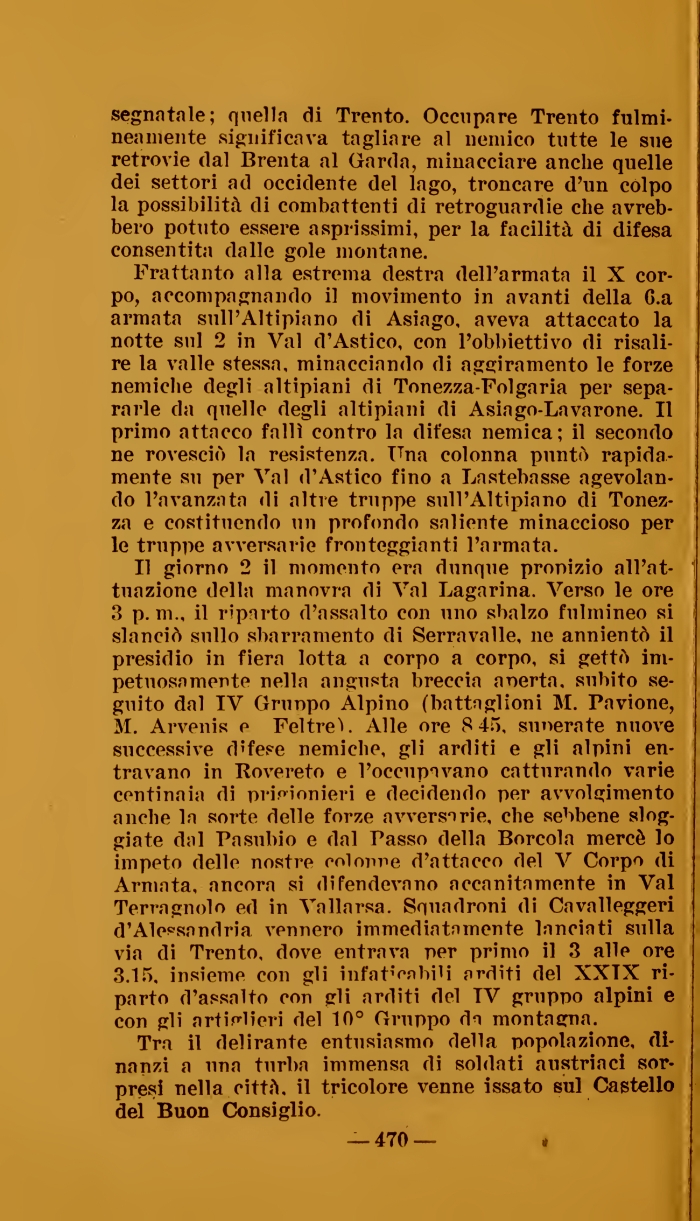 Il giorno 2 il momento era dunque propizio all'attuazione della manovra di Val Lagarina. Verso le ore 3 p. m., il riparto d'assalto con uno sbalzo fulmineo si slanciò sullo sbarramento di Serravalle, ne annientò il presidio in fiera lotta a corpo a corpo, si gettò impetuosamente nella angusta breccia aperta, subito seguito dal IV Grunpo Alpino (battaglioni M. Pavione, M. Arvenis e FeltreV Alle ore 8 45, sunerate nuove successive difese nemiche, gli arditi e gli alpini entravano in Rovereto e l'occupavano catturando varie centinaia di prigionieri e decidendo per avvolgimento anche la sorte delle forze avversi ri e, che sebbene sloggiate dal Pasubio e dal Passo della Borcola mercè lo impeto dello nostre colonne d'attacco del V Corpo di Armata, ancora si difendevano accanitamente in Val Terragnolo ed in Vallarsa. Squadroni di Cavalleggeri d'Alessandria vennero immediatamente lanciati sulla via di Trento, dove entrava per primo il 3 alle ore 3.15, insieme con gli infat'cabiU arditi del XXTX riparto d'assalto con gli arditi del TV gruppo alpini e con gli artiglieri del 10° Gruppo dn montagna.