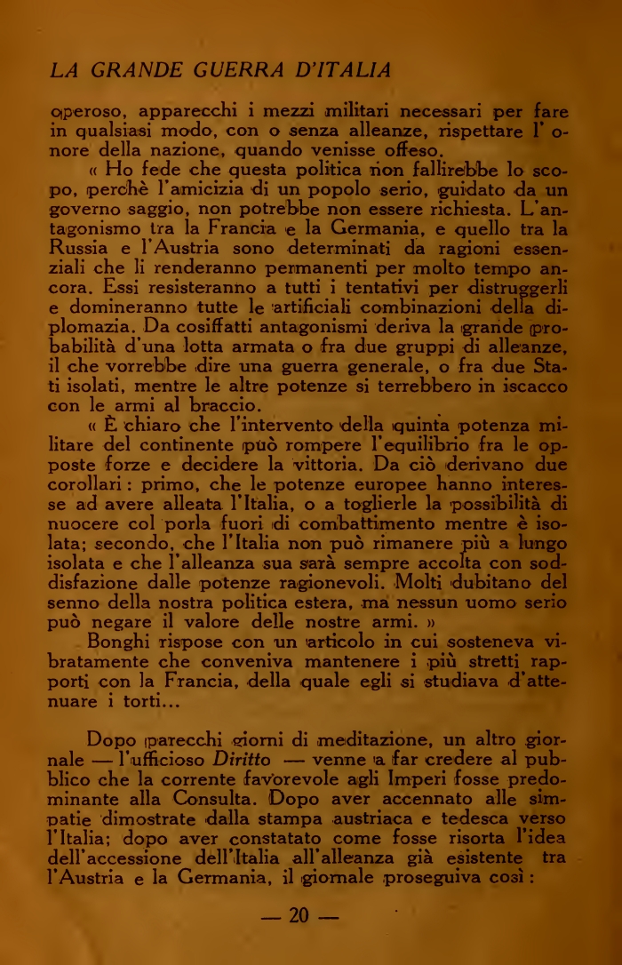LA GRANDE GUERRA D'ITALIAqperoso, apparecchi i mezzi militari necessari per fare in qualsiasi modo, con o senza alleanze, rispettare 1* o-nore della nazione, quando venisse offeso.