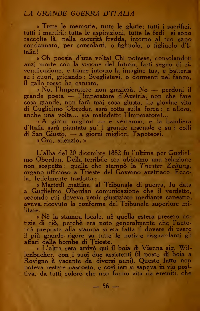 L'alba del 20 dicembre 1882 fu l'ultima per Guglielmo Oberdan. Della terribile ora abbiamo una relazione non sospetta : quella che stampò la Triester Zeitung, organo ufficioso a Trieste del Governo austriaco. Eccola, fedelmente tradotta :