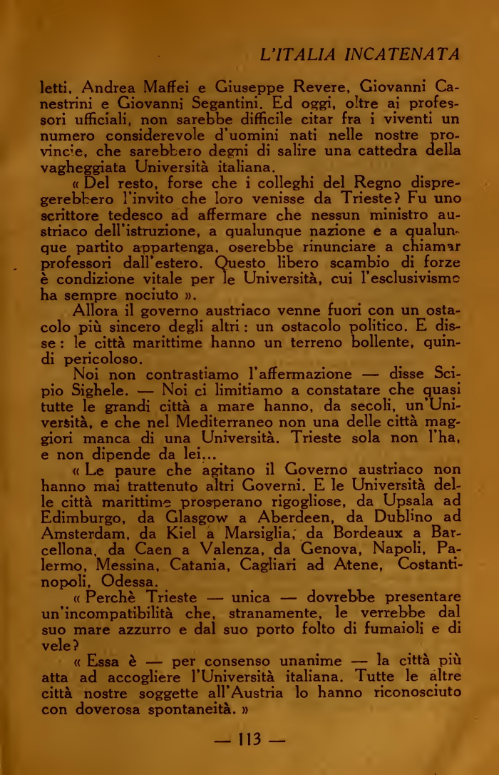 « Del resto, forse che i colleghi del Regno dispregerebbero l'invito che loro venisse da Trieste? Fu uno scrittore tedesco ad affermare che nessun ministro austriaco dell'istruzione, a qualunque nazione e a qualunque partito appartenga, oserebbe rinunciare a chiamar professori dall'estero. Questo libero scambio di forze è condizione vitale per le Università, cui l'esclusivismo ha sempre nociuto )>.