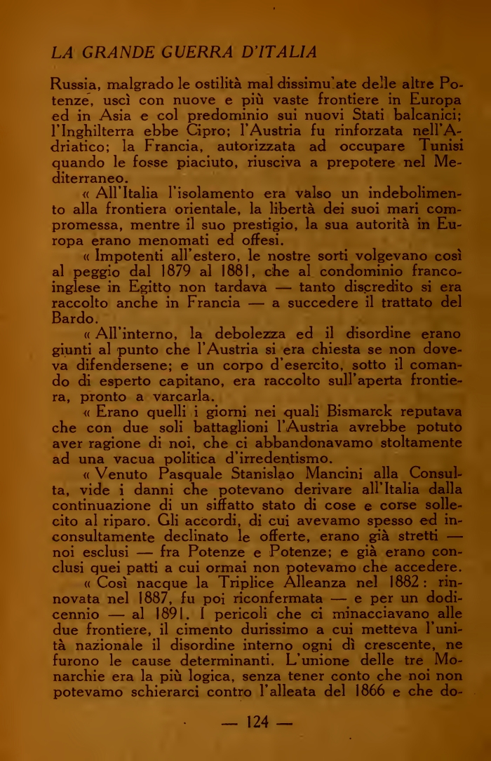 « Così nacque la Triplice Alleanza nel 1882 : rinnovata nel 1887, fu poi riconfermata — e per un dodicennio — al 1891. I pericoli che ci minacciavano alle due frontiere, il cimento durissimo a cui metteva l'unità nazionale il disordine interno ogni dì crescente, ne furono le cause determinanti. L'unione delle tre Monarchie era la più logica, senza tener conto che noi non potevamo schierarci contro l'alleata del 1866 e che do-