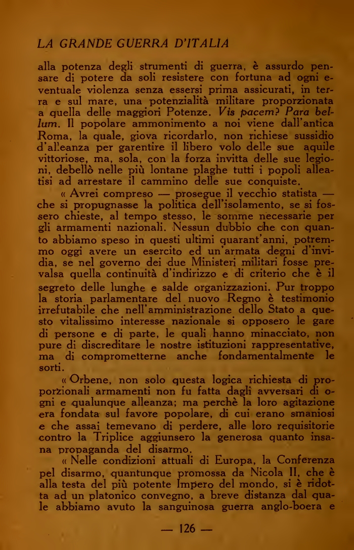 LA GRANDE GUERRA D'ITALIAalla potenza degli strumenti di guerra, è assurdo pensare di potere da soli resistere con fortuna ad ogni e-ventuale violenza senza essersi prima assicurati, in terra e sul mare, una potenzialità militare proporzionata a quella delle maggiori Potenze. Vis pacem? Para bel-lum. Il popolare ammonimento a noi viene dall'antica Roma, la quale, giova ricordarlo, non richiese sussidio d'alleanza per garentire il libero volo delle sue aquile vittoriose, ma, sola, con la forza invitta delle sue legioni, debellò nelle più lontane plaghe tutti i popoli alleatisi ad arrestare il cammino delle sue conquiste.