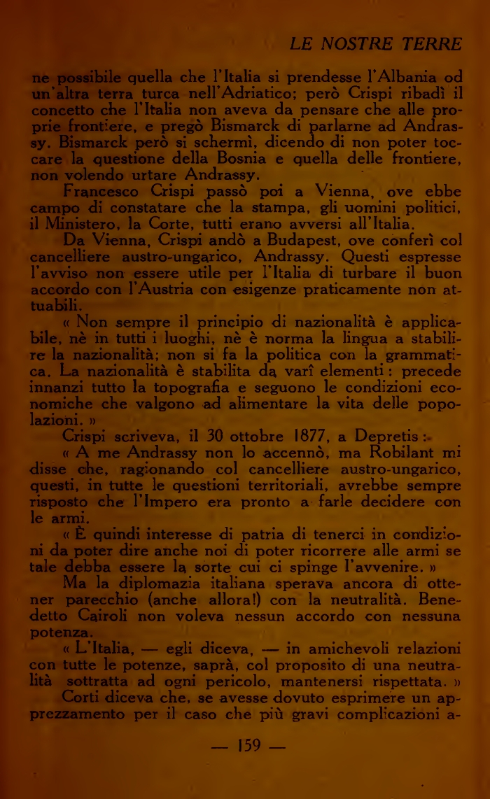 LE NOSTRE TERREne possibile quella che l'Italia si prendesse l'Albania od un'altra terra turca nell'Adriatico; però Crispi ribadì il concetto che l'Italia non aveva da pensare che alle proprie frontiere, e pregò Bismarck di parlarne ad Andras-sy. Bismarck però si schermì, dicendo di non poter toccare la questione della Bosnia e quella delle frontiere, non volendo urtare Andrassy.