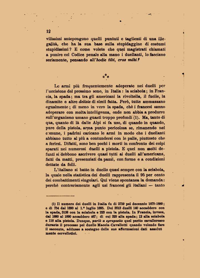 (1) Il numero dei duelli in Italia fu di 2759 pel decennio 1879-1889 ; e di 754 dal 1890 al 1.° luglio 1895. Dei 3513 duelli 140 accaddero con la spada, 3138 con la sciabola e 223 con la pistola. In Franoia, invece, dal 1880 al 1890 acoaddero 467; di cui 329 alla spada; 12 alla sciabola e 118 alla pistola. Dunque, parlò a sproposito quel perito cavalleresco durante il processo pel duello Macola-Cavallotti quando volendo fare il sacoente, addusse a sostegno delle sue affermazioni dati assolut mente cervellotici.