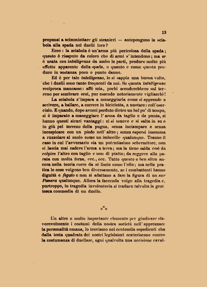 Ed è per tale intelligenza, lo si sappia una buona volta, che i duelli sono tanto frequenti da noi. Se questa intelligenza reciproca mancasse: afte mia, pochi scenderebbero sul terreno per sembrare eroi, pur essendo notoriamente vigliacchi !