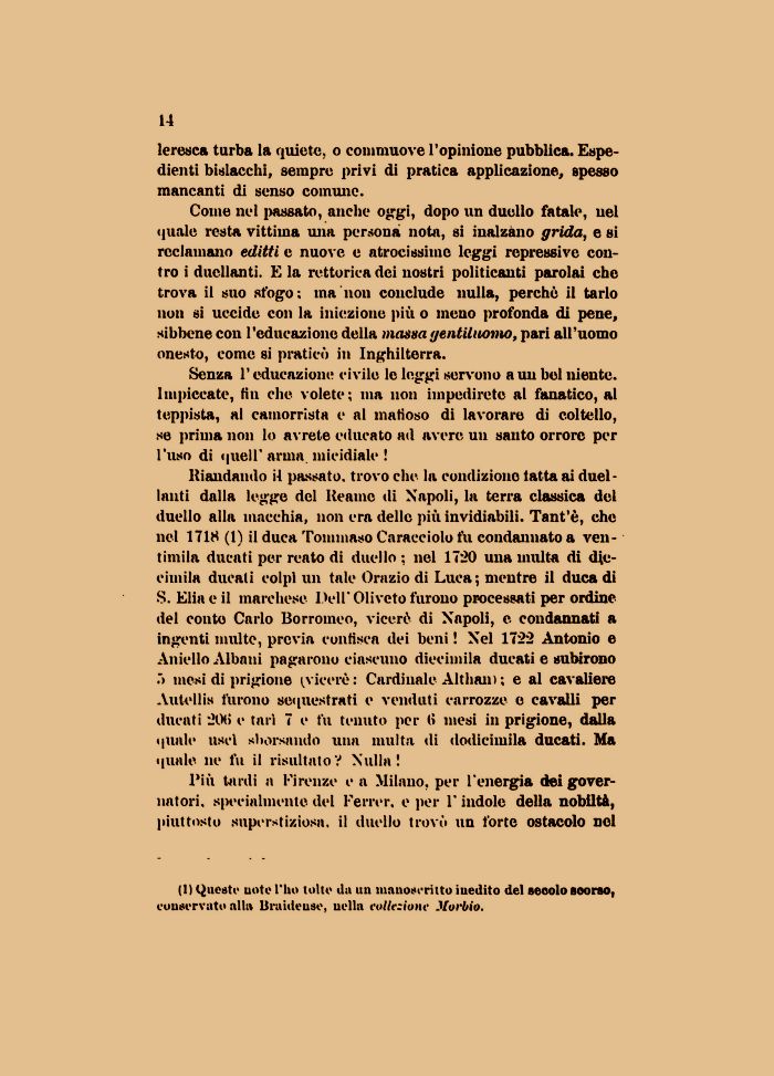 Come nel passato, anche oggi, dopo un duello fatale, nel quale resta vittima una persona nota, si inalzano grida, e si reclamano editti e nuove e atrocissime leggi repressive contro i duellanti. E la rettorica dei nostri politicanti parolai che trova il suo sfogo; ma non conclude nulla, perchè il tarlo non si uccide con la iniezione più o meno profonda di pene, sibbene con l'educazione della massa gentiluomo, pari all'uomo onesto, come si praticò in Inghilterra.