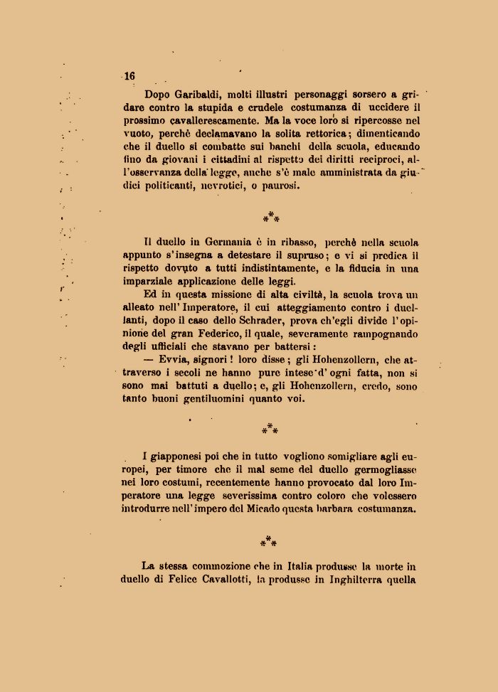 Dopo Garibaldi, molti illustri personaggi sorsero a gridare contro la stupida e crudele costumanza di uccidere il prossimo cavallerescamente. Ma la voce loro si ripercosse nel vuoto, perchè declamavano la solita rettorie» -, dimenticando che il duello si combatte sui banchi della scuola, educando fino da giovani i cittadini al rispetto dei diritti reciproci, all'osservanza della' legge, anche s'è male amministrata da giù dici politicanti, nevrotici, o paurosi.