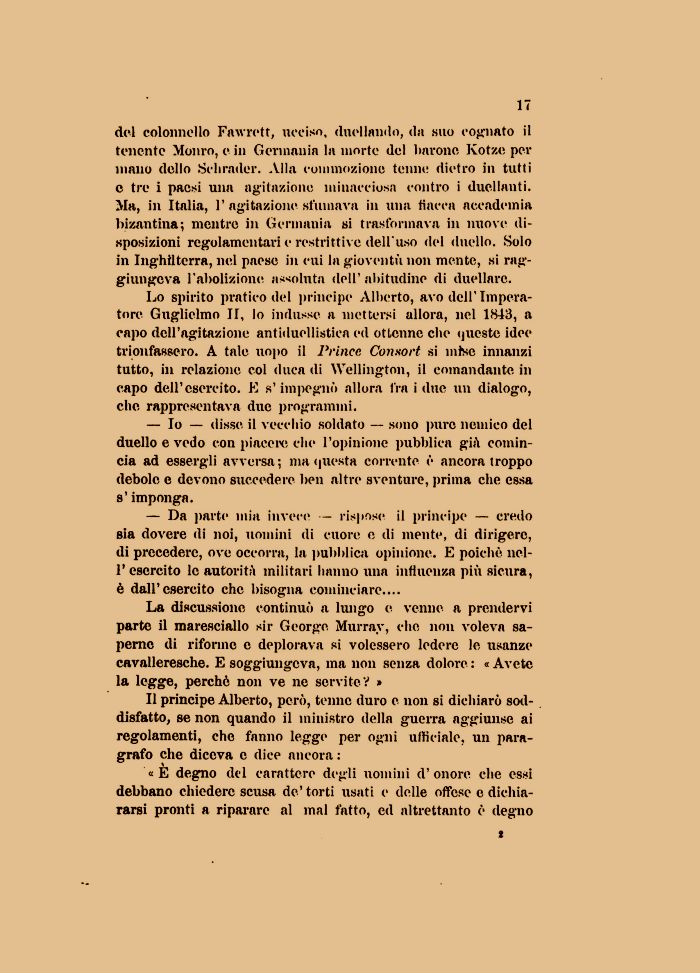 Lo spirito pratico del principe Alberto, avo dell' Imperatore Guglielmo II, lo indusse a mettersi allora, nel 1843, a capo dell'agitazione antiduellistica ed ottenne che queste idee trionfassero. A tale uopo il Prinee Conxort si mise innanzi tutto, in relazione col duca di Wellington, il comandante in capo dell'esercito. E s'impegnò allora fra i due un dialogo, clic rappresentava due programmi.