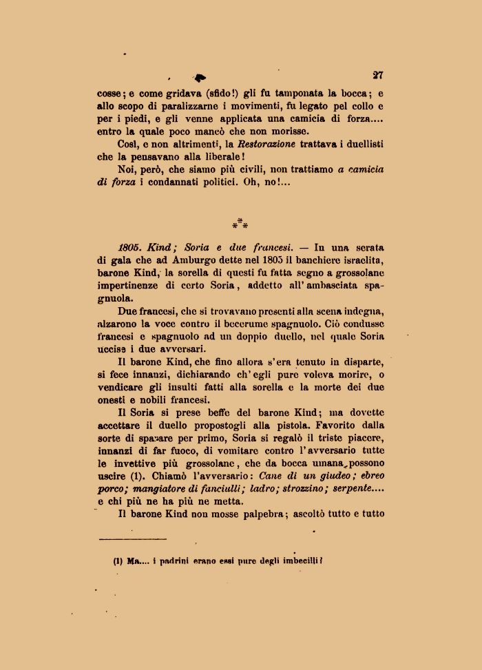 Il Soria si prese beffo del barone Kind; ma dovette accettare il duello propostogli alla pistola. Favorito dalla sorte di spaiare per primo, Soria si regalò il triste piacere, innanzi di far fuoco, di vomitare contro l'avversario tutte le invettive più grossolane, che da bocca umana., possono uscire (1). Chiamò l'avversario: Cane di un giudeo ; ebreo porco; mangiatore di fanciulli ; ladro ; strozzino ; serpente.... e chi più ne ha più ne metta.
