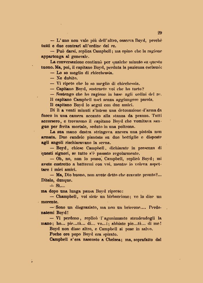 Di li a venti minuti s'intese una detonazione d'arma da fuoco in una camera accanto alla stanza da pranzo. Tutti accorsero, e trovarono il capitano Boyd che vomitava saligne per ferita mortale, seduto in una poltrona.