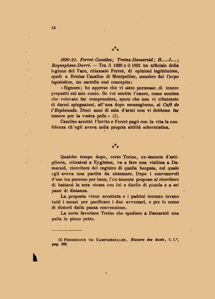 1820-21. Ferret-Cazalles; Treins-Dai narzid ; H....-L...; Roqueplane-Durré. — Tra il 1820 e il 1821 ùn ufficiale della legione del Varo, chiamato Ferret, di opinioni legittimiste, spedi a Brutus Cazalles di Montpellier, membro del Corpo legislativo, un cartello cosi concepito:
