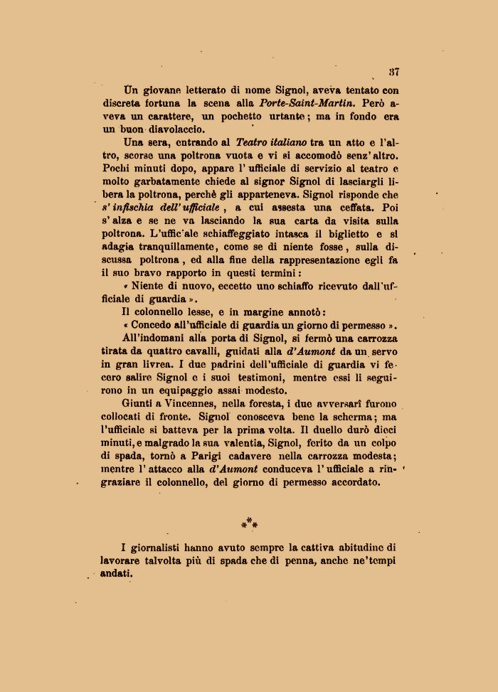 Giunti a Vincennes, nella foresta, i due avversari furono collocati di fronte. Signol conosceva bene la scherma; ma l'ufficiale si batteva per la prima volta. Il duello durò dieci minuti, e malgrado la sua valentia, Signol, ferito da un colpo di spada, tornò a Parigi cadavere nella carrozza modesta; mentre 1' attacco alla d'Aumont conduceva 1' ufficiale a rih- ' graziare il colonnello, del giorno di permesso accordato.