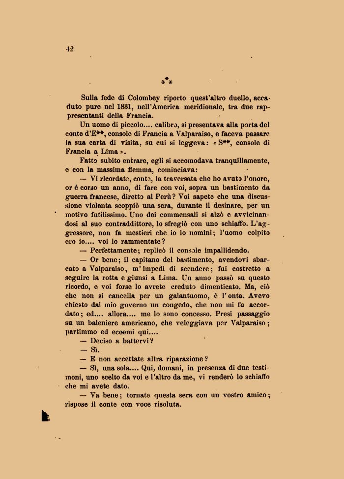 — Vi ricordate, cont?,, la traversata che ho avuto l'onore, or è cordo un anno, di fare con voi, sopra un bastimento da guerra francese, diretto al Perù ? Voi sapete che una discussione violenta scoppiò una sera, durante il desinare, per un motivo futilissimo. Uno dei commensali si alzò e avvicinandosi al suo contraddittore, lo sfregiò con uno schiaffo. L'aggressore, non fa mestieri che io lo nomini; l'uomo colpito ero io.... voi lo rammentate?