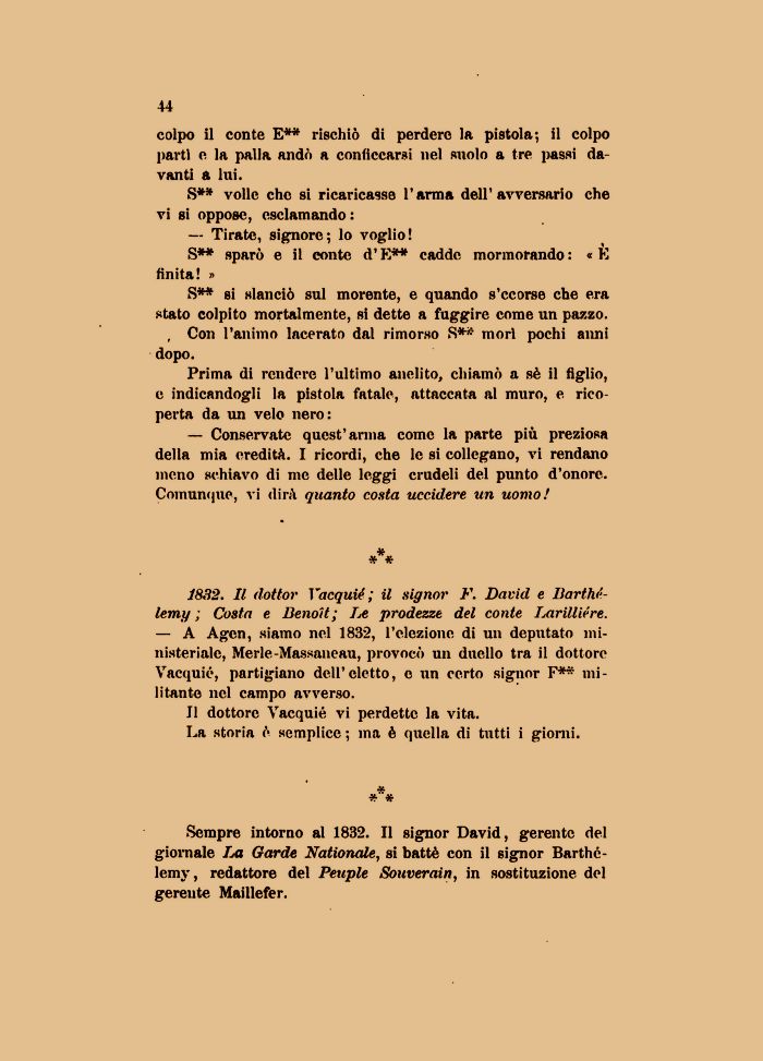 1832. Il dottor Vacquié ; il signor V. David e Iìarthé-lemy ; Costa e Benoit; Le prodezze del conte Larìlliére. — A Agen, siamo nel 1832, l'elezione di un deputato ministeriale, Merle-Massaneau, provocò un duello tra il dottore Vacquié, partigiano dell'eletto, e un certo signor F** militante nel campo avverso.