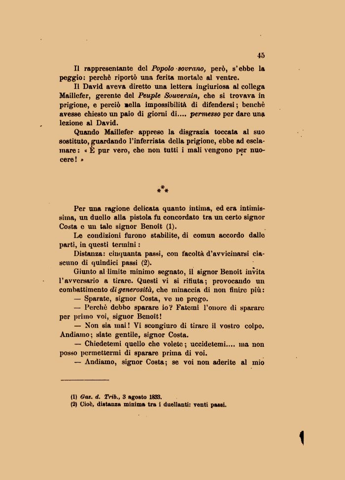 Per una ragione delicata quanto intima, ed era intimis-siina, un duello alla pistola fu concordato tra un certo signor Costa e un tale signor Benoit (1).