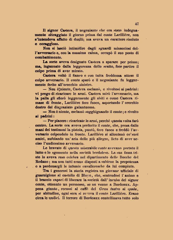 — Non òjniente, Castera esclamò, e rivoltosi ai padrini : vi prego di ricaricare le armi. Castera mirò l'avversario, ma la palla gli sfiorò leggermente gli abiti e come Castera rimase di fronte, Larilliére fece fuoco, asportando 1' orecchio destro del disgraziato galantuomo.