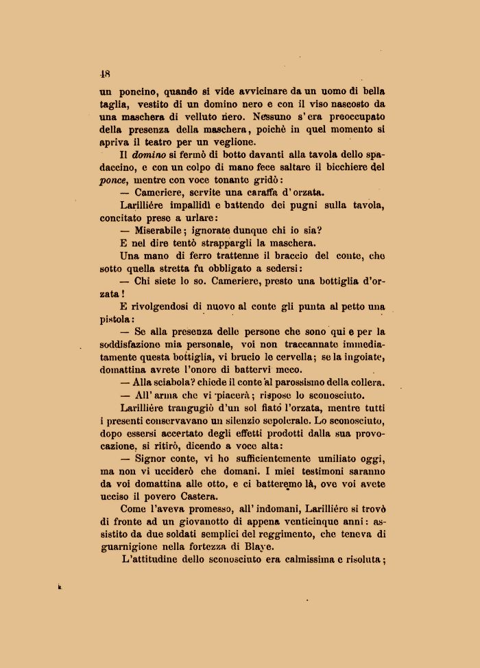 — Se alla presenza delle persone che sono qui e per la soddisfaziono mia personale, voi non traccannate immediatamente questa bottiglia, vi brucio le cervella; se la ingoiate, domattina avrete l'onore di battervi meco.