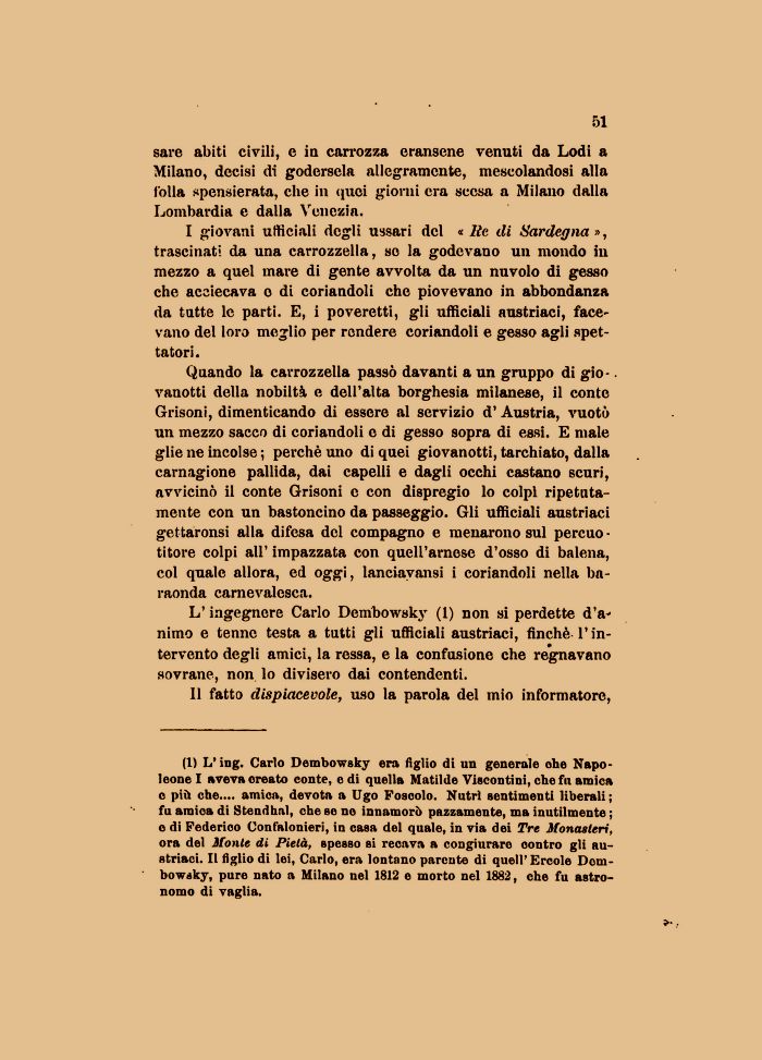(1) L' ing. Carlo Dembowsky era figlio di un generale ohe Napoleone I aveva oreato eonte, e di quella Matilde Viseontini, che fu amica e più che.... amica, devota a Ugo Foscolo. Nutrì sentimenti liberali; fu amica di Stendhal, che se no innamorò pazzamente, ma inutilmente ; e di Federico Confalonieri, in casa del quale, in via dei Tre Monasteri, ora del Monte di Pietà, spesso si recava a congiurare oontro gli austriaci. Il figlio di lei, Carlo, era lontano parente di queir Ercole Dembowsky, pure nato a Milano nel 1812 e morto nel 1882, che fu astronomo di vaglia.