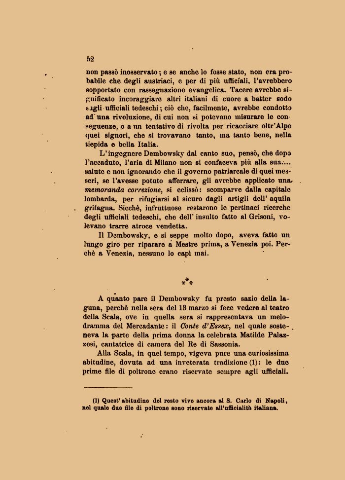 Alla Scala, in quel tempo, vigeva pure una curiosissima abitudine, dovuta ad una inveterata tradizione (1) : le duo prime file di poltrone erano riservate sempre agli ufficiali.