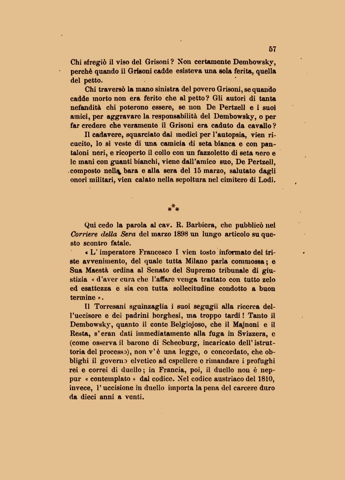 Chi traversò la mano sinistra del povero Grisoni, se quando cadde morto non era ferito che al petto ? Gli autori di tanta nefandità chi poterono essere, se non De Pertzell e i suoi amici, per aggravare la responsabilità del Dembowsky, o per far credere che veramente il Grisoni era caduto da cavallo ?